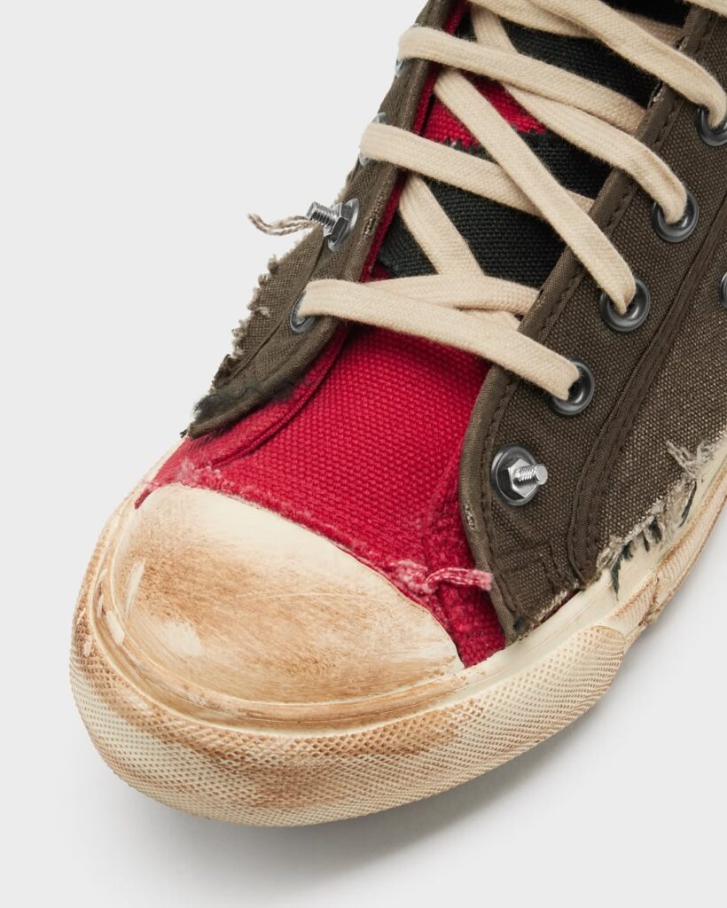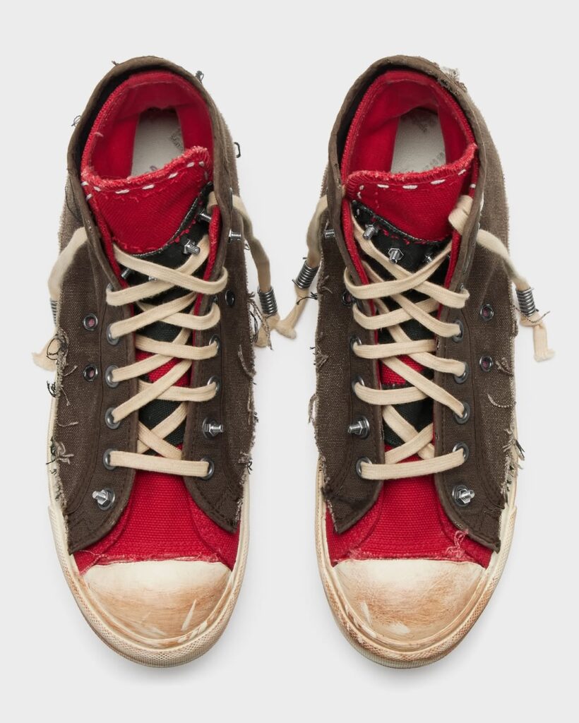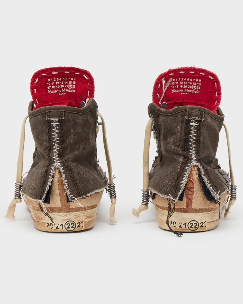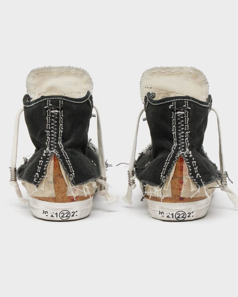 Meski terlihat rusak, craftsmanship sepatu ini sangat tinggi. Lapisan kanvas bertumpuk, jahitan dibuat sengaja kasar, bagian tumit terbelah, dan elemen logam terlihat kasar semua dirancang untuk memberikan estetika raw. Warna seolah pudar dan sol tampak aus, namun semuanya terukur dan estetis. Distressing pada Margiela bukan “rusak asal-asalan”, melainkan seni konstruksi balik. Ini bukti bahwa estetika industrial dan nostalgia dapat bersatu menciptakan statement fashion penuh makna.