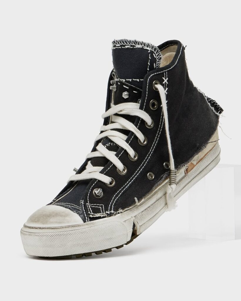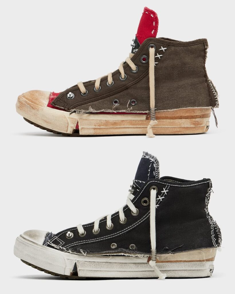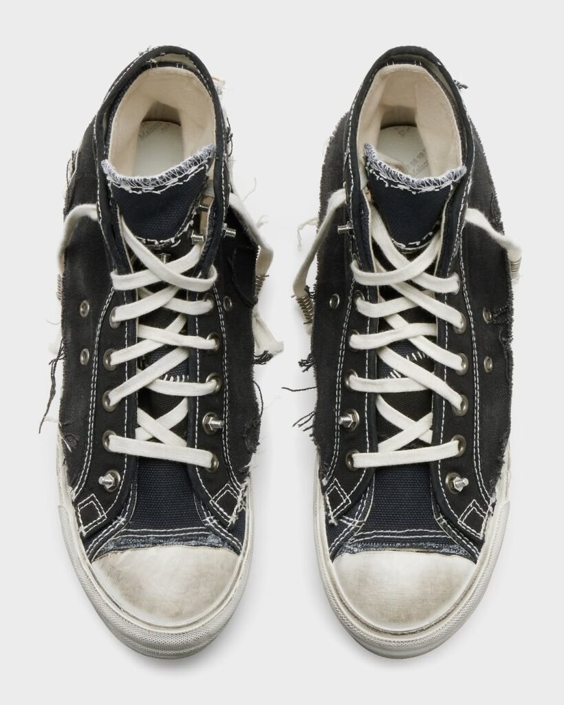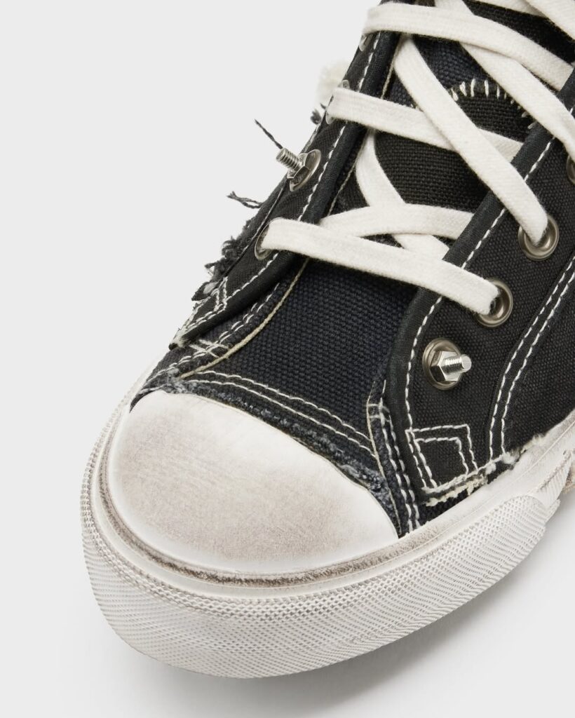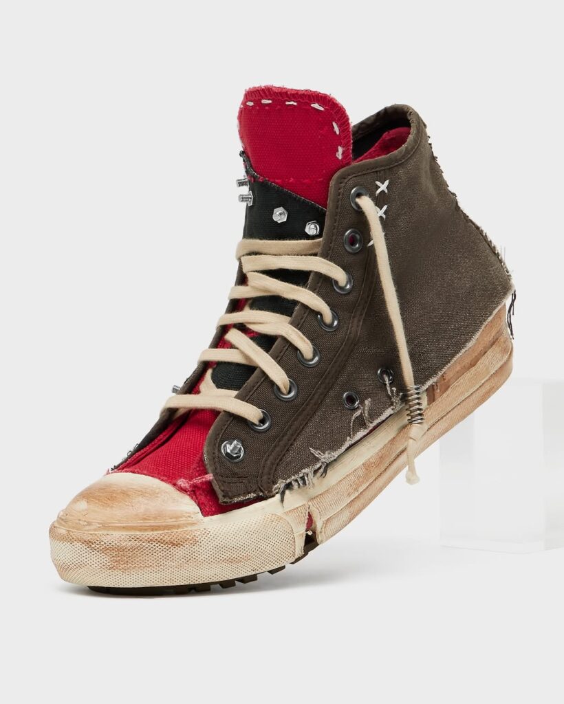 Meski terlihat rusak, craftsmanship sepatu ini sangat tinggi. Lapisan kanvas bertumpuk, jahitan dibuat sengaja kasar, bagian tumit terbelah, dan elemen logam terlihat kasar semua dirancang untuk memberikan estetika raw. Warna seolah pudar dan sol tampak aus, namun semuanya terukur dan estetis. Distressing pada Margiela bukan “rusak asal-asalan”, melainkan seni konstruksi balik. Ini bukti bahwa estetika industrial dan nostalgia dapat bersatu menciptakan statement fashion penuh makna.