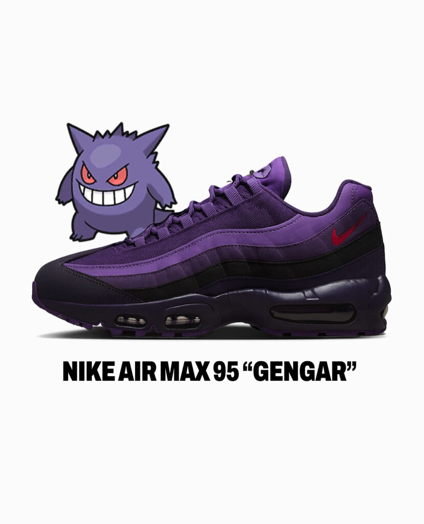 Di antara berbagai edisi yang dirilis, Nike Air Max 95 “Gengar” mencuri perhatian paling besar. Warna ungu pekatnya menggambarkan karakter misterius Gengar dengan sempurna. Lalu, aksen merah di logo Swoosh menambah sentuhan energik yang khas. Kombinasi warna gelap dan lapisan hitam di bagian midsole menciptakan tampilan kuat dan berani. Selain itu, elemen reflektif di bagian atas memberi efek modern dan futuristik yang sesuai dengan kepribadian Gengar.