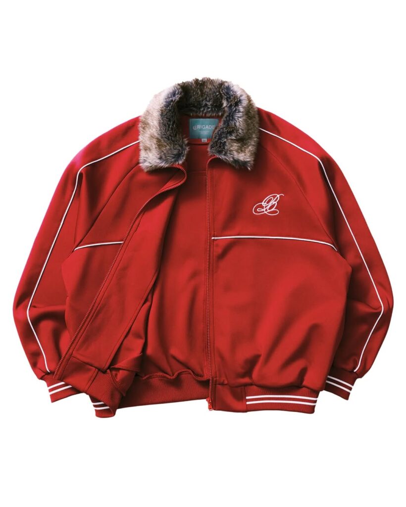 Sebagai penutup, BRIGADE meluncurkan jaket merah dengan kerah berbulu sintetis. Detail piping putih menambah kesan retro sport, sementara logo kecil di dada kiri memberi sentuhan elegan. Jaket ini jelas dirancang untuk jadi centerpiece, baik dari segi warna maupun desain, menjadikannya salah satu item paling standout dalam koleksi Fall/Winter ‘25.