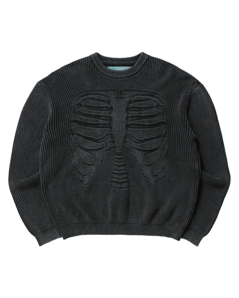 Salah satu item paling mencolok adalah sweater hitam dengan detail tekstur berbentuk tulang rusuk. Desain 3D ini menambahkan kedalaman visual, memberikan nuansa edgy dan misterius. Selain menjadi pilihan fashion statement, sweater ini juga fungsional sebagai pelindung tubuh di musim dingin. BRIGADE berhasil menggabungkan estetika gelap dengan kenyamanan.