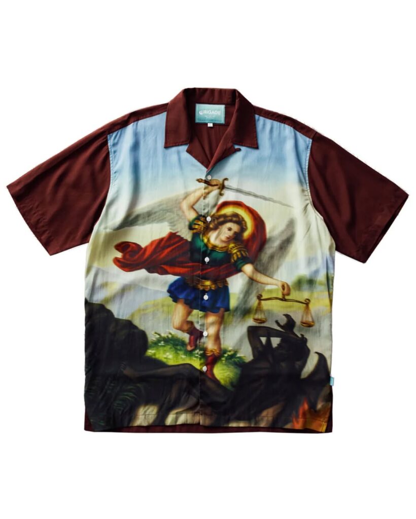 Selain kemeja panjang, BRIGADE juga merilis kemeja lengan pendek dengan ilustrasi St. Michael yang dramatis. Potongan relaxed fit membuatnya nyaman dipakai, sementara grafis besar di bagian depan menegaskan statement fashion yang kuat. BRIGADE jelas ingin menghadirkan pakaian yang bukan sekadar busana, melainkan juga medium ekspresi artistik.