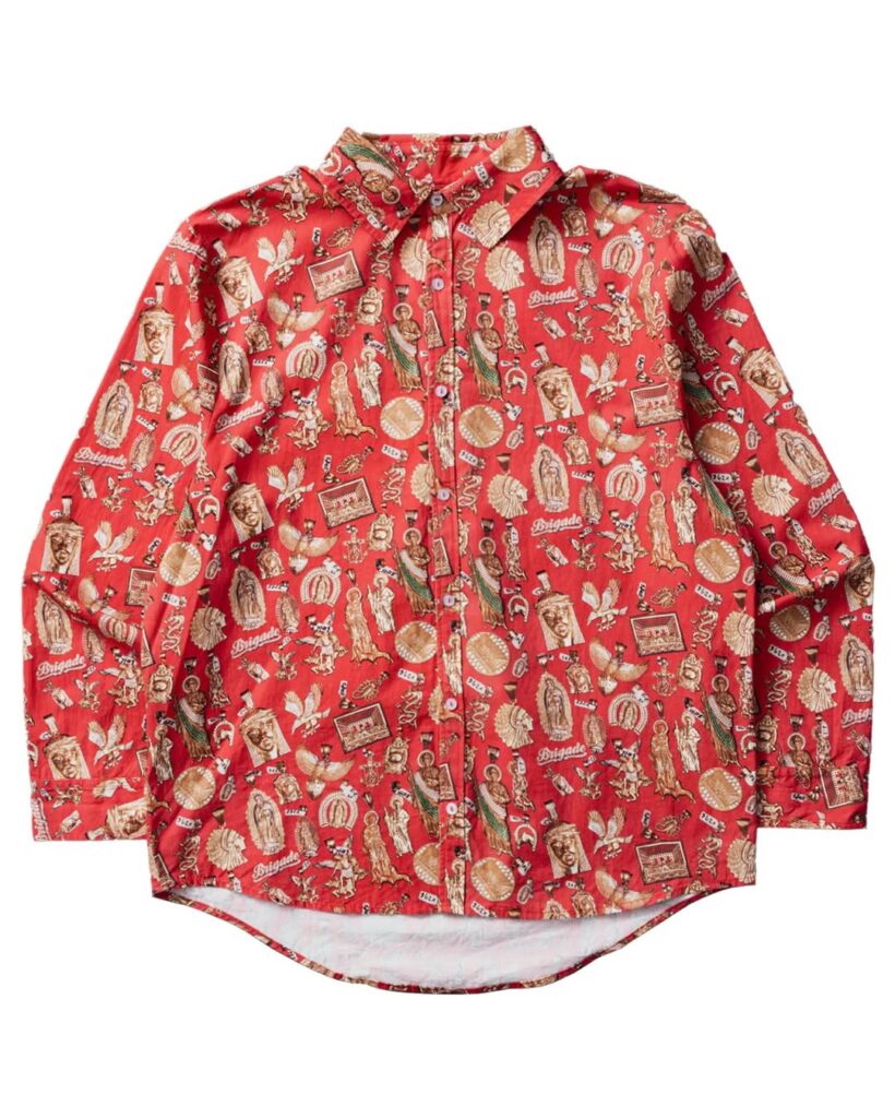 Yang menarik dari koleksi kali ini adalah kemeja lengan panjang bermotif penuh dengan gambar ikon-ikon religius dan simbol klasik. Desain ini membawa nuansa retro sekaligus eksperimental, seolah menghadirkan museum visual dalam bentuk pakaian. Dengan warna dasar merah, kemeja ini tampil mencolok, cocok untuk mereka yang ingin tampil unik dan berbeda dari arus utama.